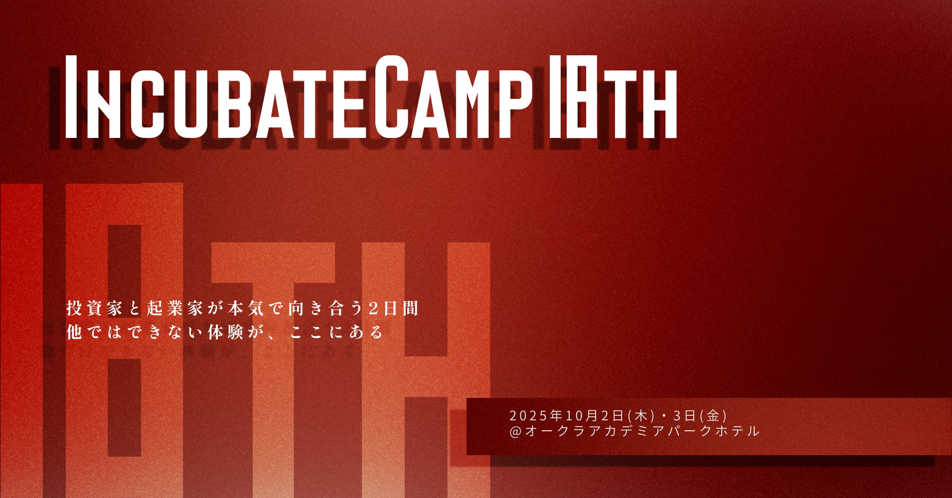 インキュベイトファンド株式会社(所在地:東京都港区、代表パートナー:赤浦 徹、本間 真彦、和田 圭祐、村田 祐介、ポール・マクナーニ 以下インキュベイトファンド)は、2025年10月2日(木)・3日(金)に合宿型アクセラレーションプログラム『Incubate Camp 18th』を開催することをお知らせいたします。本日4月1日(火)から7月31日(木)まで、起業家のエントリー受付を行います。